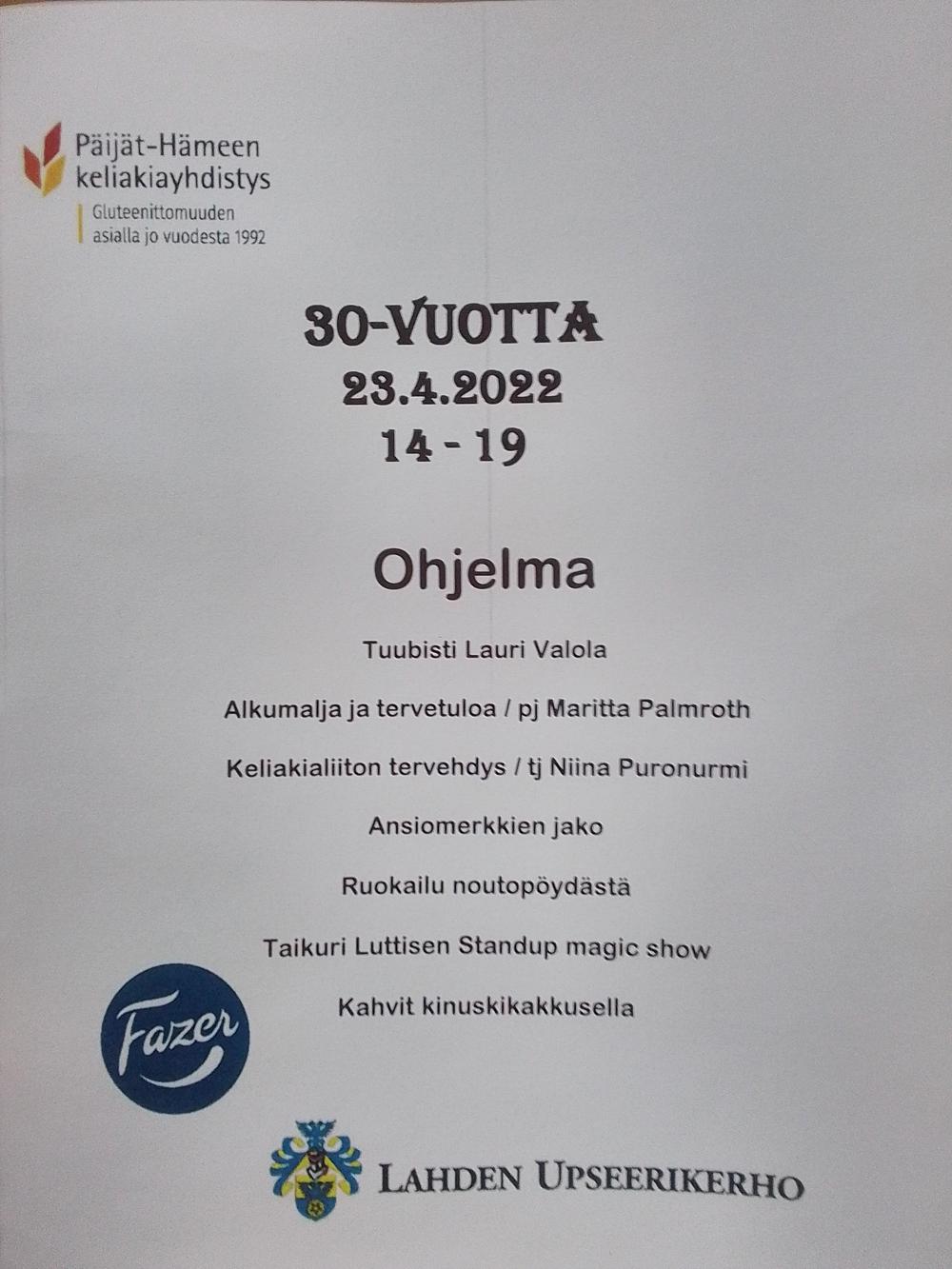 Musiikkia, taikuutta ja ruokailu (G,L) noutopöydästä. Keliakialiiton toiminnanjohtaja Niina Puronurmi on juhlassamme mukana. Maksu 10 e jäsen ja 20 e ei-jäsen. Sitovat ilmoittautumiset ja maksu 16.4.2022 mennessä paijathameen.keliakiayhdistys@gmail.com tai Kirsi puh. 040 350 0550. Maksu yhdistyksen tilille FI1656121120151268 viite 20239.